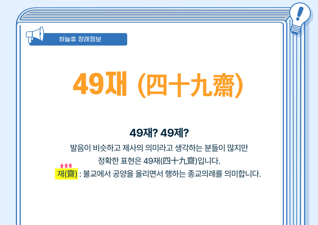 많은 분들이 49재와 49제를 혼동해서 사용하십니다. 발음이 비슷하다 보니 헷갈리시는 것 같은데, 정확한 표현은 49재(四十九齋)입니다. 칠칠일(七七日) 또는 칠칠재(七七齋)라고도 부르는데, 재(齋)는 불교에서 공양을 올리면서 행하는 종교의례를 의미합니다.