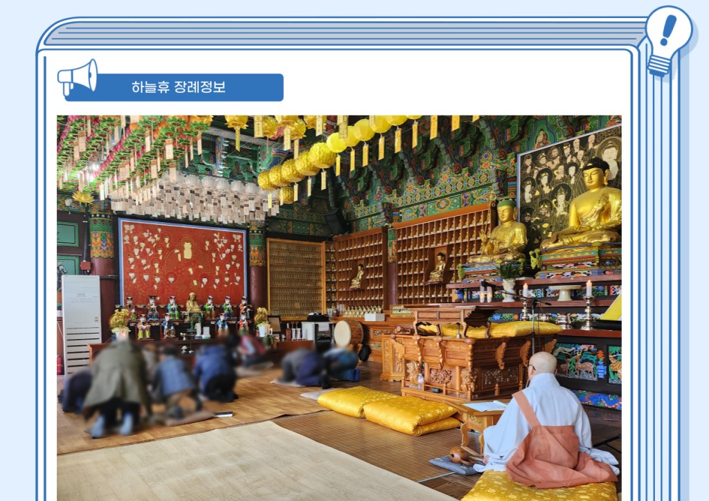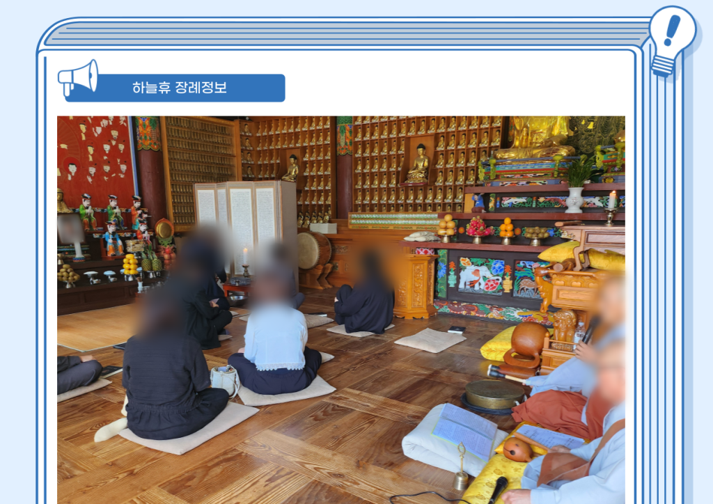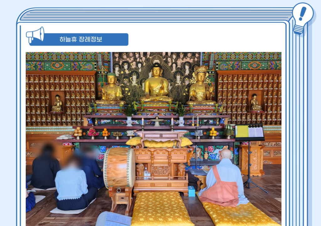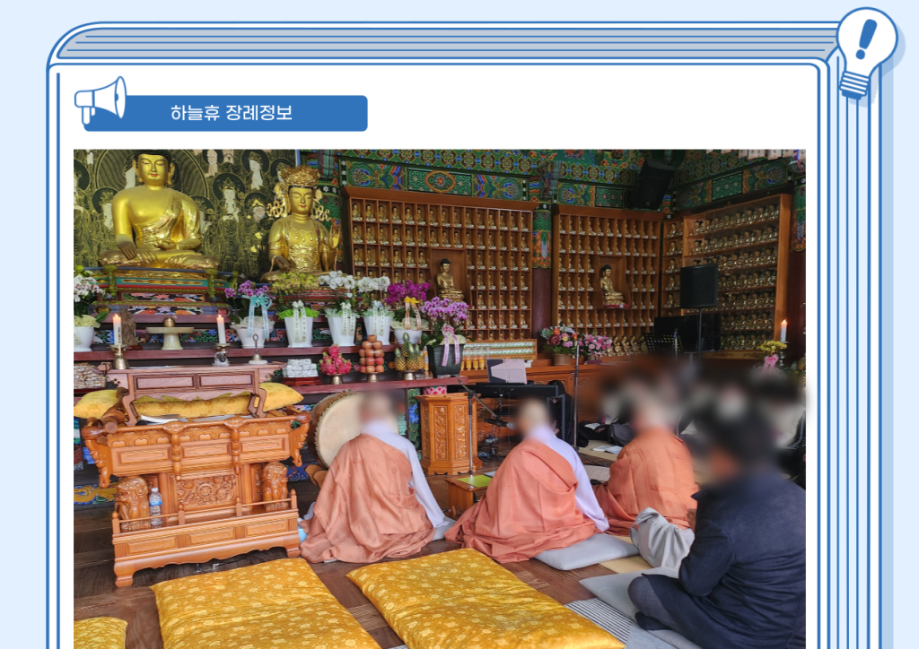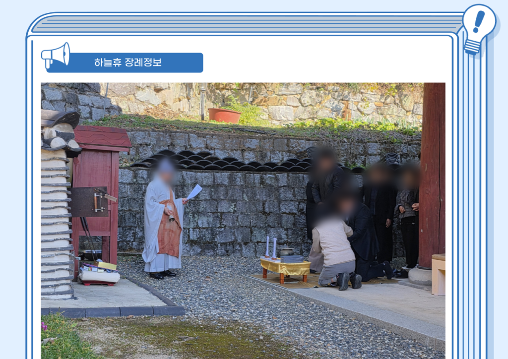 하늘휴에서는 유족분들의 상황에 맞춰 49재의미와 절차를 안내해드리고 있습니다. 불교식 장례를 진행하시는 경우 지내는 일정까지 세심하게 도움을 드리며, 종교가 없으신 분들께도 49재의 의미를 충분히 설명드린 후 선택할 수 있도록 안내해드립니다.